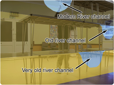 the course of the river channel, which today is only apparent by dips or rises in the landscape